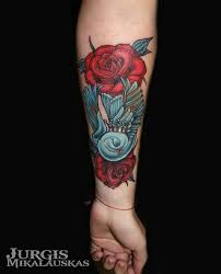 2 Large Roses And One Blue Birds Forearm Tattoos Tattoos For Guys Forearm Tattoo