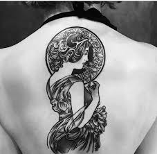 My First Tattoo Black And Grey Alphonse Mucha Painting Back Piece Art Nouveau Tattoo Nouveau Tattoo Back Tattoo