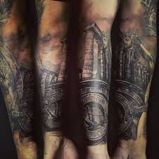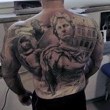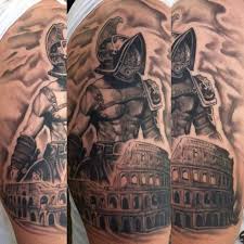 Accurate Painted Black And White Antic Roman Arena Tattoo On Shoulder Combined With Old Gladiator Gladiator Tattoo Shoulder Tattoo Warrior Tattoos