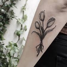 Blackwork Three Tulip Bundle Tattoo On The Back Of The Left Forearm Bouquet Tattoo Back Of Forearm Tattoo Beautiful Flower Tattoos