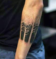 Man With Negative Space Black Ink Tree Forest Tattoos On Outer Forearm Forearm Tattoos Outer Forearm Tattoo Forest Tattoos