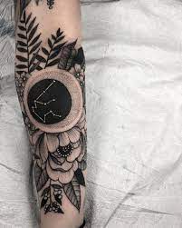 Negative Space Aquarius Constellation Tattoo Inked On The Left Forearm With Flowers Around Aquarius Constellation Tattoo Space Tattoo Negative Space Tattoo