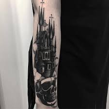 Cool Blackwork Skull And Castle Tattoo On Forearm By Laurenmelina Castle Tattoo Tattoos Blackwork Tattoo