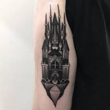Terrific Castle Tattoo On Arm This One Is Perhaps The Most Terrifying Castle Tattoo Design On The List An Tatuagem De Castelo Tatuagem De Manga Tatuagem Preta