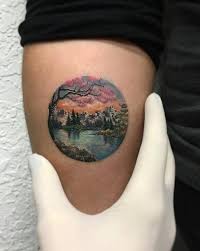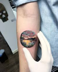 Landscape Circle Tattoo On The Right Inner Forearm Circular Tattoo Circle Tattoos Mountain Tattoo