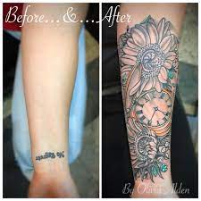 Sunflower And Pocket Watch With Child S Birth Time Coverup Forearm Tattoo Tattoos For Kids Pocket Watch Tattoo Design Pocket Watch Tattoo