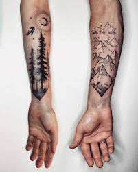 Landscape Tattoos For A Couple By Sasha Tattooing Hiking Tattoo Tattoos Outer Forearm Tattoo