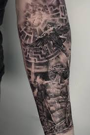 Full Sleeve Greek Theme Icarus S Father Daedalus A Talented Craftsman Built The Labyrinth For King Minos To Imp Mythology Tattoos Greek Tattoos Maze Tattoo
