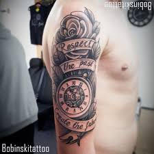 Respect The Past Create The Future Roses And Pocket Watch Tattoo By Mark Wright Bobinski Tattoo As Arm Tattoos For Guys Watch Tattoos Pocket Watch Tattoo