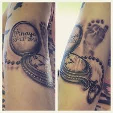 Tattoo With Name Date And Time Of Birth For Son Clock Tattoo Clock Tattoo Tattoos Name Tattoos
