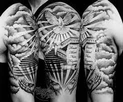 Stairs To Heaven Scroll Hands And Dove Custom Tattoo Heaven Tattoos Sky Tattoos Dove Tattoos