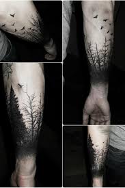 Beautiful Black Ink Silhouette Tattoo Though I M Pinning It Because Of The Fade Out At The Wrist Which Nature Tattoo Sleeve Tree Sleeve Tattoo Forest Tattoos
