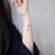 Blue Moon Yellow Orange Sun Arm Female Tattoos Gallery White Background Black Blouse Hair Small Tattoos Small Girl Tattoos Tiny Tattoos For Girls