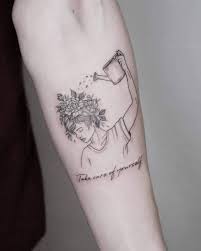 A Tattoo Of A Girl Watering Her Head And A Phrase Take Care Of Yourself Below Inked On The Left Inner Forearm Self Love Tattoo Tattoos Love Yourself Tattoo