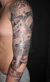 Black And Grey Stars And Microphone Tattoo On Sleeve Full Sleeve Tattoos Star Sleeve Tattoo Tattoo Sleeve Men