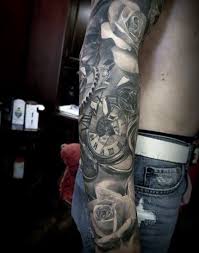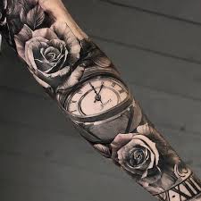 Cool Grey Tattoo Of Roses And Roman Numeral Clock Mens Full Sleeves Cool Tattoos For Guys Tattoos For Guys Rose Tattoo Sleeve