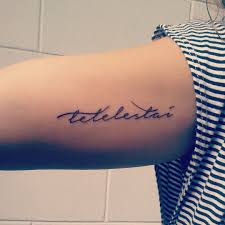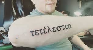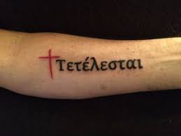 My Tetelestai Tattoo Cursive Greek Translation Of It Is Finished Jesus Last Words 3 Crosses Higher Middle Cross Greek Tattoos Cursive Tattoos Tattoos