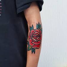 Bold Traditional Red Rose Tattoo On The Left Forearm Tattoo Traditional Rose Tattoos Rose Tattoos For Men Red Rose Tattoo