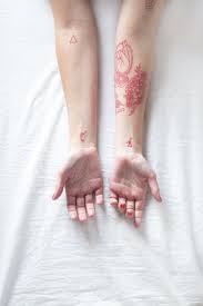 Red Tattooes From Eva S Arms She Has No Fewer Than Eighteen To Date When Asked Why The Red Tattoos She Tells Me That Red Tattoos Red Ink Tattoos Ink Tattoo