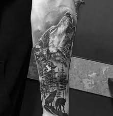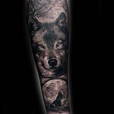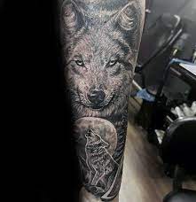 Wolf Howling At Moon Guys Realistic Forearm Sleeve Tattoo Ideas Forearm Sleeve Tattoos Wolf And Moon Tattoo Wolf Tattoo Design
